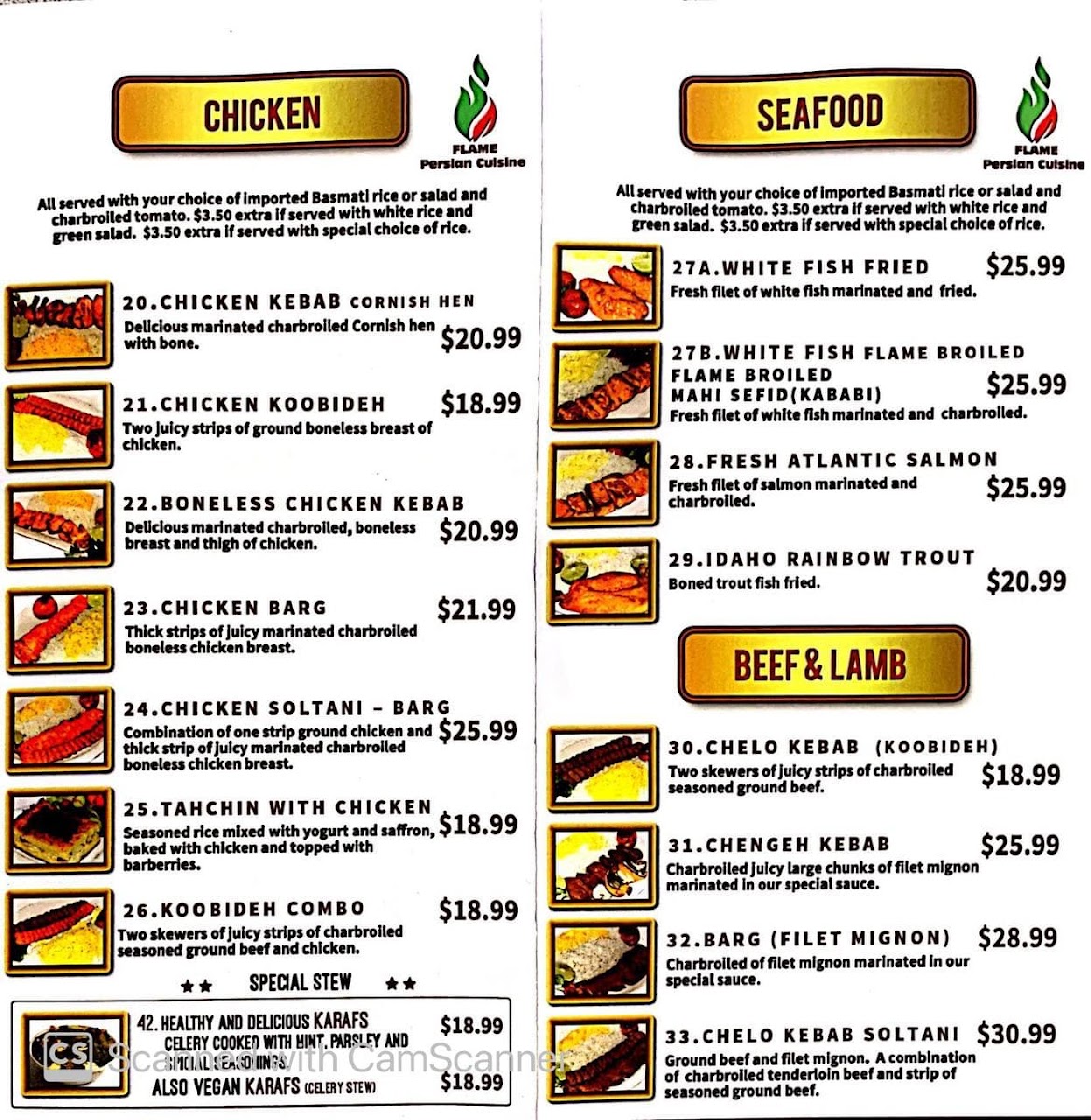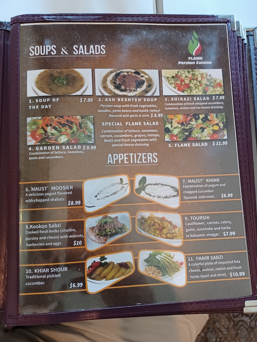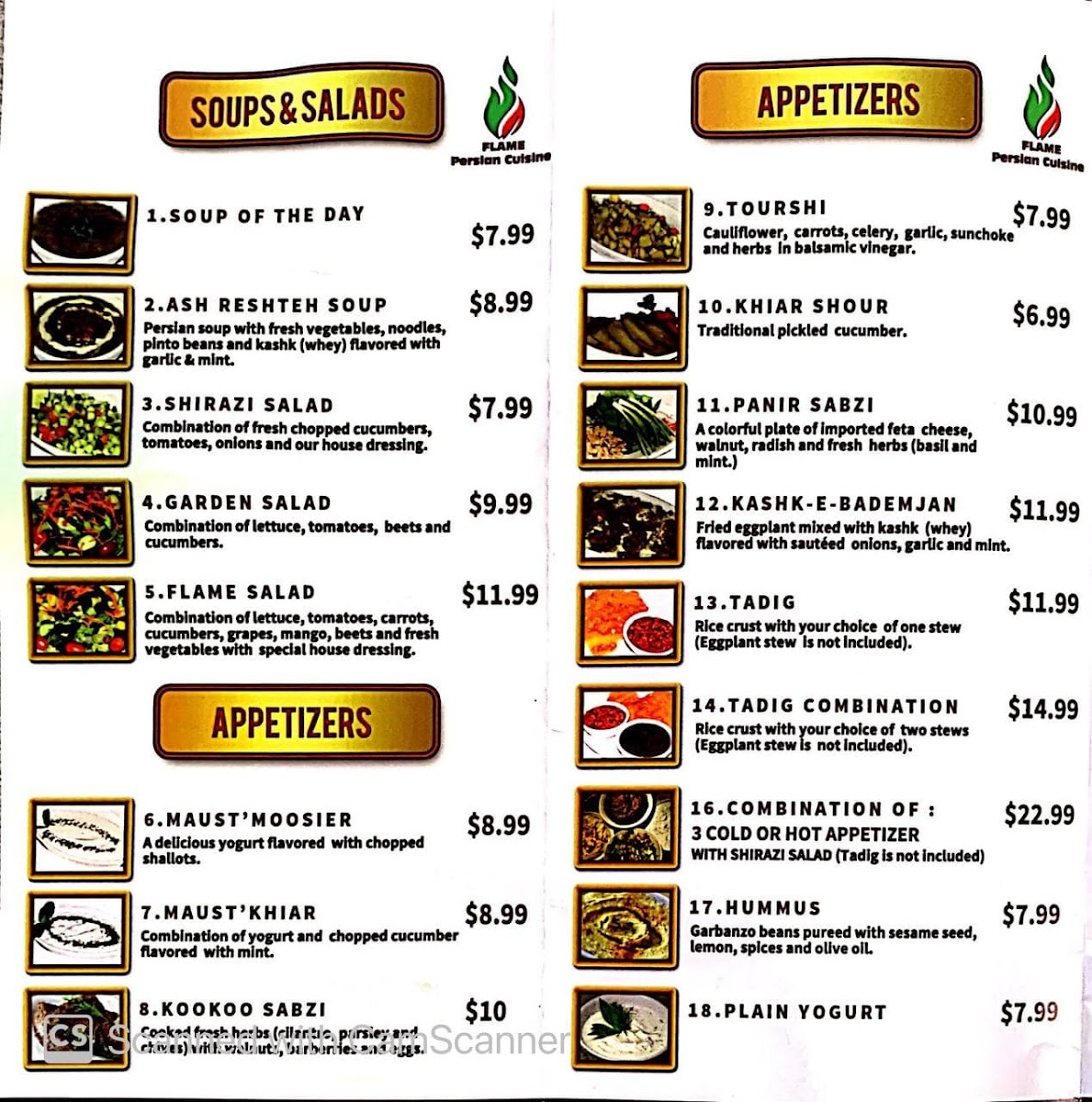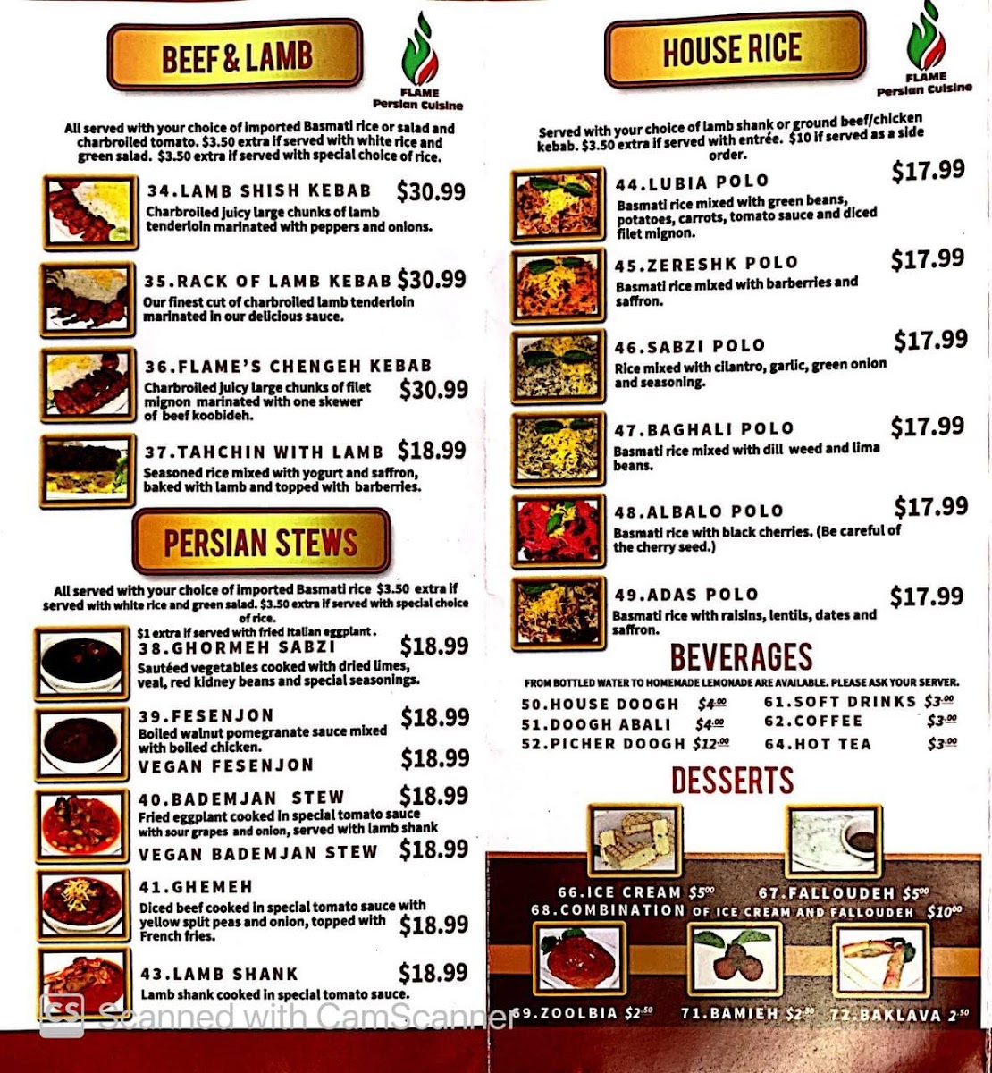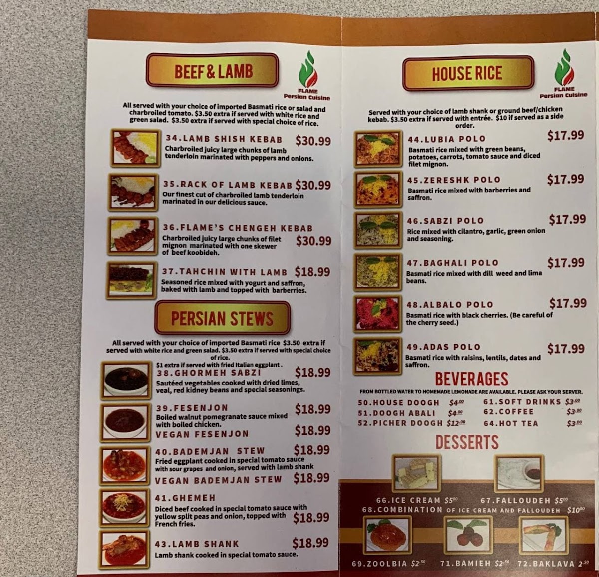 Step inside Flame, and you’ll be embraced by a warm and inviting atmosphere that sets the tone for a memorable meal. The restaurant exudes authenticity, with its vibrant decor that transports you to a world reminiscent of ancient Persia. Whether you choose to dine in or enjoy the convenience of takeout, the team at Flame is dedicated to providing exceptional service, ensuring each dining experience is exquisite.
